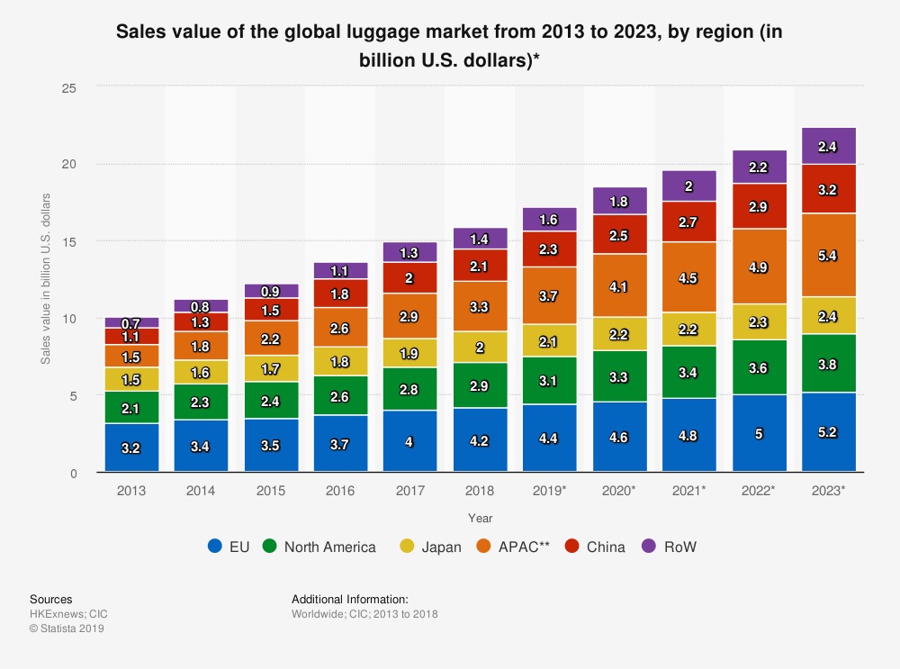 La línea de tiempo muestra el valor de las ventas minoristas en el mercado global de equipaje de 2013 a 2018 y proporciona un pronóstico de 2019 a 2023. Durante 2018, el valor de las ventas minoristas del mercado de equipaje de América del Norte fue de aproximadamente 2 mil 900 millones de dólares.