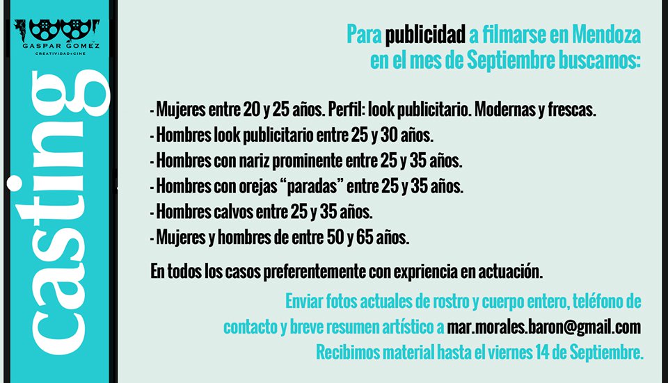 En efecto, el director del spot, Gaspar Gómez, publicó una convocatoria en Facebook para actores mendocinos que “quieran participar en una publicidad a filmarse en breve”.