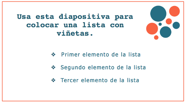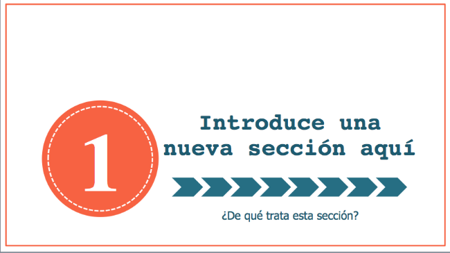 Para cada uno de estos elementos (título, encabezados de sección y algunos puntos de apoyo) crea una diapositiva. A continuación, un ejemplo de cómo pueden ser esas diapositivas: