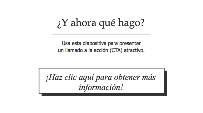 Es importante crear diapositivas que incluyan tu llamado a la acción y tu conclusión (pero no es necesario ahondar en ellas por el momento).