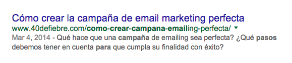 Cuando estás viendo una SERP (página de resultados del motor de búsqueda), hay solo tres cosas que aparecen: el título de la página, la descripción de la página (puntos de bonificación si tienes una meta descripción dirigida específicamente) y el URL de tu página. Procura tratar los títulos de páginas, como los títulos de los posts de tu blog y haz que sean útiles e intersantes.