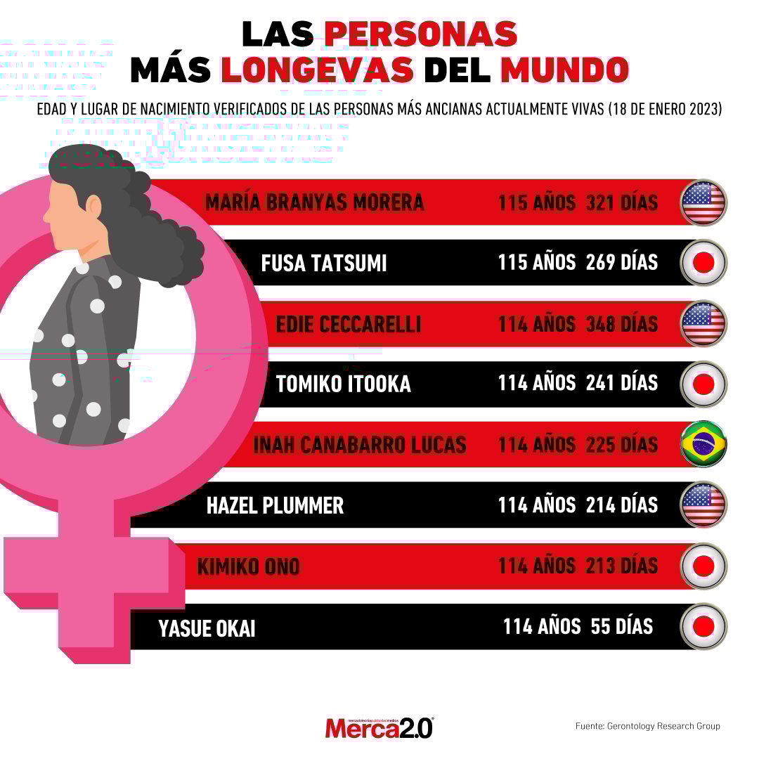 Con 115 años de edad, Branyas Morera encabeza el ranking de las ocho personas más longevas del mundo, de las cuales todas son mujeres.