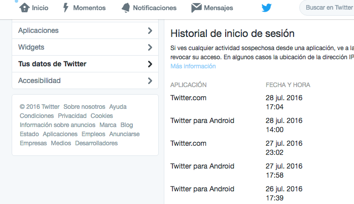 Un aspecto que destaca en Twitter es que implementó una estrategia similar a Facebook, en ambas puedes ir a “Configuración” y revisar los dispositivos en los que has iniciado sesión recientemente. En la red social de los 140 caracteres vas a “Tus datos de Twitter”, para ver smartphones, navegadores y aplicaciones, y revocar el acceso desde aplicaciones.