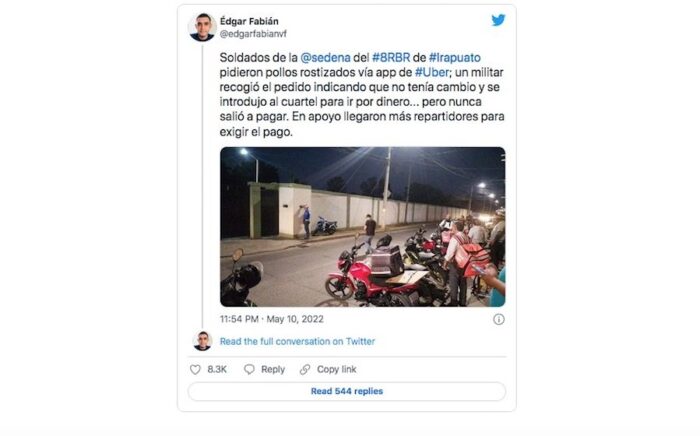 Información reportada por Irapuato Noticias Comunica, señala que una orden de 45 pollos solicitados a través de Uber Eats se entregó a militares de la Secretaría de la Defensa Nacional (Sedena), solo que estos al asegurar que iban por el dinero para liquidar el pedido ya no salieron del cuartel y dejaron con la deuda al repartidor, lo que motivó una protesta de sus compañeros a las afueras de las instalaciones del octavo Regimiento Blindado de Reconocimiento en Irapuato, Guanajuato.