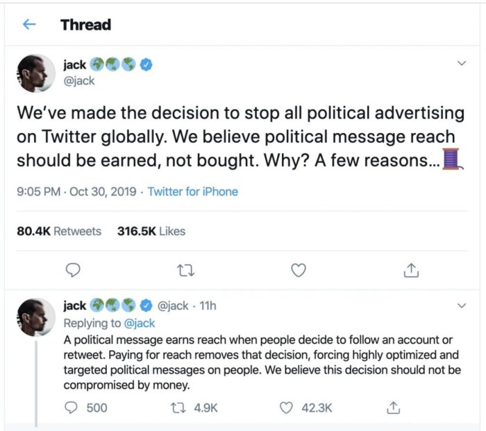 Jack Dorsey, CEO de Twitter, anuncia en un hilo en su cuenta su decisión de que su compañía deje de aceptar anuncios de campañas políticas, argumentando que el alcance de un mensaje político debe depender de decisiones libres de las personas cuando deciden seguir una cuenta o retuitearla, y no porque alguien ha pagado para forzarles a recibirla. El mensaje político en una red social debe ser ganado, no comprado. Para Dorsey, «si bien la publicidad en Internet es increíblemente poderosa y muy efectiva para los anunciantes en entornos comerciales, ese mismo poder conlleva riesgos significativos para la política».