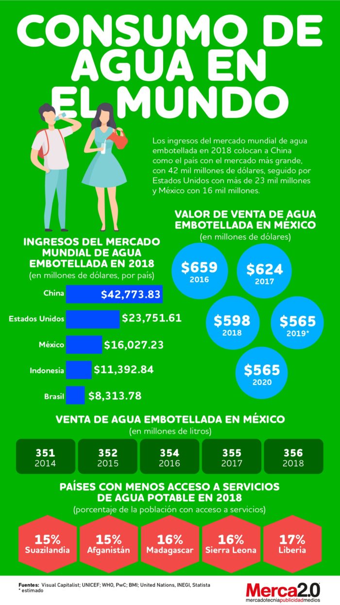 Las industrias requieren agua para funcionar. En el caso del mercado del agua embotellada en específico, el 2018 se centró en China como su mercado más grande, con 42 mil millones de dólares, seguido de Estados Unidos con más de 23 mil millones y México con 16 mil millones.