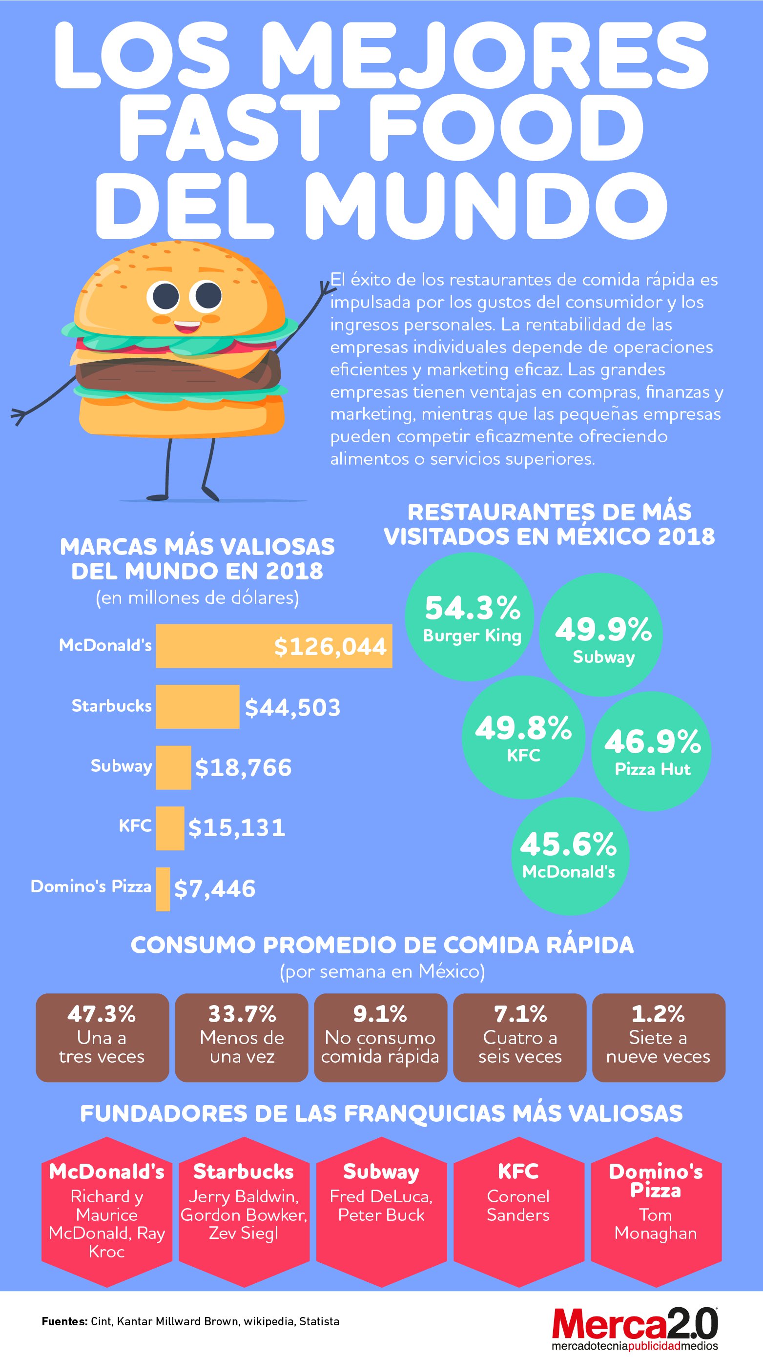 Según el valor de la marca de las 10 firmas de comida rápida más valiosas del mundo durante 2018, McDonald’s fue la marca de comida rápida más valiosa del mundo con un valor estimado en alrededor de 126.04 mil millones de dólares. En tanto, Starbucks registró aproximadamente 44.5 mil millones de dólares; Subway logró 18.7 mmdd; KFC acumuló 15.1 mmmd y Domino’s Pizza 7.4 mmdd.