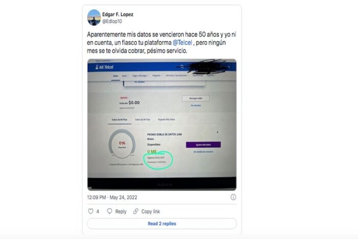 Edgar F. López denunció en su cuenta de Twitter cómo Telcel le reportó en su cuenta que los datos móviles a los que tiene derecho e vencieron en 1970, década en que el uso de este espectro para navegación o comunicación a través de apps de mensajería aún no existía.