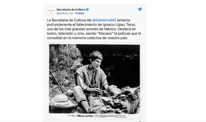 La Secretaría de Cultura del @GobiernoMX lamenta profundamente el fallecimiento de Ignacio López Tarso, uno de los más grandes actores de México. Destacó en teatro, televisión y cine, siendo “Macario” la película que lo consolidó en la memoria colectiva de nuestro país. pic.twitter.com/POg9q2QYSo