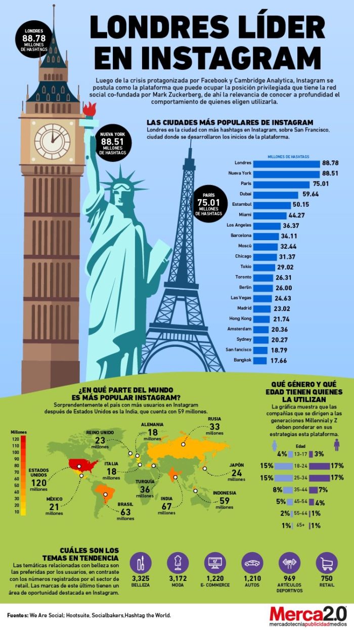Pero, ¿quiénes lo usan más, qué buscan y desde dónde? Para que conozcas todos esos detalles hemos preparado para ti una infografía en la que se puede ver que Londres es la ciudad más popular. Tiene más hashtags que New York, París, Dubai, Estambul, Miami, Los Ángeles o Barcelona.