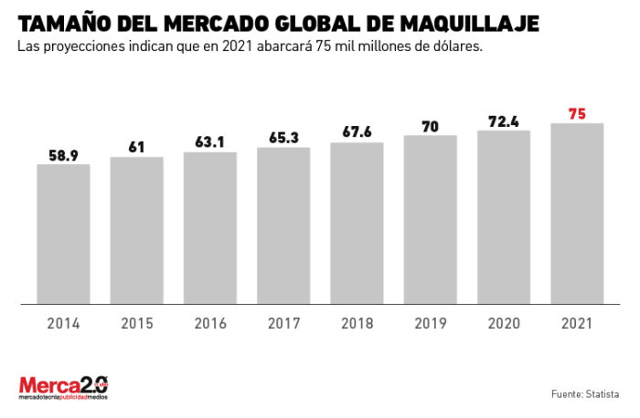 Datos de Trefis.com, proyectados por Statista, indican que este año el tamaño del mercado del maquillaje alcanzará los 67.6 mil millones de dólares, lo que aumentaría hasta 70 mmdd en 2019.