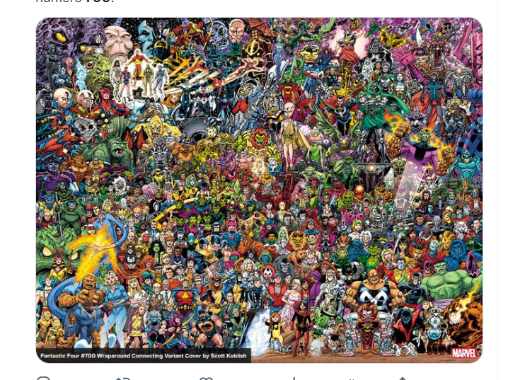 ¡Scott Koblish ha dibujado una portada con los más de 700 personajes que han aparecido en Los Cuatro Fantásticos para celebrar el próximo número 700! pic.twitter.com/jlpVQxtZZD