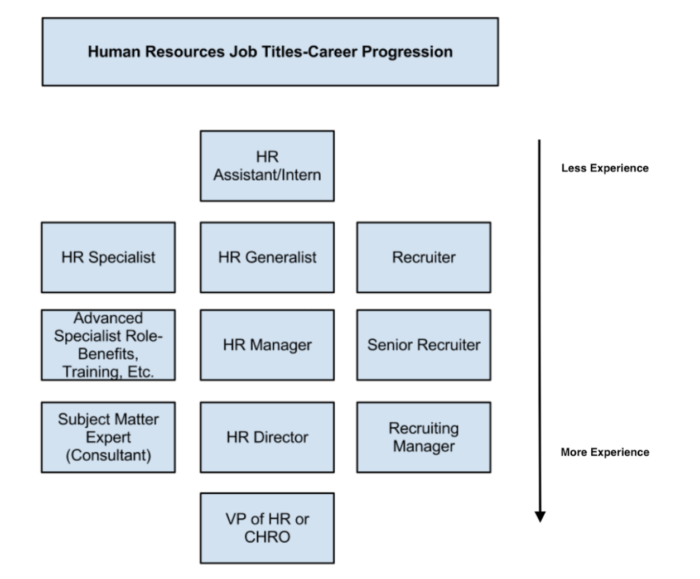 If someone ends up staying in the HR field for the majority of their career, they may find themselves moving into a high-level position at your company. These roles may include an HR consultant, HR director, recruiting manager, or vice president of HR chief of human resources officer (CHRO).