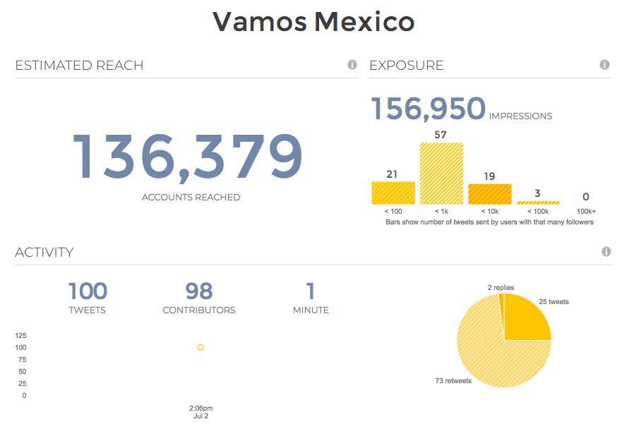 Este lunes por la mañana, “Vamos Mexico” es uno de los principales trending topics en Twitter en Estados Unidos, con más de 85 mil mensajes y un alcance de más de 136 mil cuentas, de acuerdo con datos obtenidos de TweetReach.
